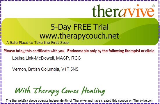 Send A Message To Louisa.- Session Fees: $130 per 50-minute indivual session, $150 for couple sessions, $18 per month for online therapy resources. See www.therapycouch.net